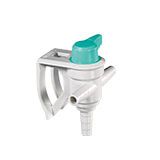 Zur Umschaltung zwischen zwei Aufnahmebehältern. Mit integriertem Geräteträger. Zur Befestigung an einer Geräteschiene mit einer Schienenklammer